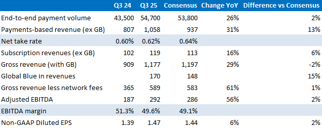 Shift4 Payments Q3 2025 results were largely in line with expectations. Total Net Revenues were up 61% YoY (including Global Blue), and Gross Profits (non-GAAP) increased 62% YoY. End-to-End volumes grew 26% YoY to $55b, slightly higher than consensus. Adjusted EBITDA rose 56% YoY to $292m (49.6% margin, down 170 bps YoY). Unit economics were effectively flat, with net spreads at 62 bps. GRLNF was up 19% YoY, or 61% YoY (including Global Blue). Exhibit AA below provides a snapshot of results vs consensus and the prior year.