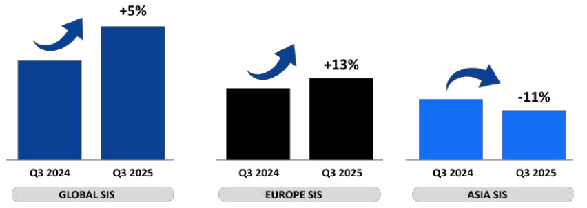 Global Blue Sales in Store (SiS) was +5% YoY driven by Europe +13% and NA offset by weaker results in Asia, where the business lapped tough comparable driven by a record low Yen last year down 11%. Exhibit AC shows trends on year over year basis. More recently though, trends in Asia recovered to be roughly flat during the month of September. Total revenues were $170m, or $156m after network fees. EBITDA contribution of $68m, and margins of ~43%.