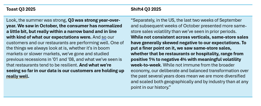 Compared to TOST management’s Q3 2025 tone on SSS volatility, FOUR’s seemed more negative (at least relatively) as show below in Exhibit AD. If you are more skeptical about FOUR, you might interpret this as them having more discretionary exposure than Toast, but I’m not convinced it’s materially different.