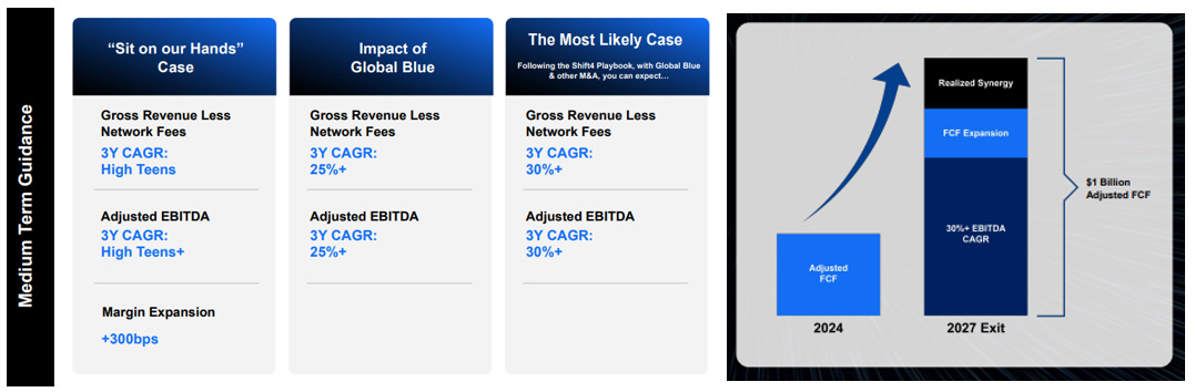 For FY2025, the company narrowed but reaffirmed guidance, including volume of $207-$210B (26-27% YoY growth), gross revenue less network fees of $1.98-$2.02B (46-49% YoY growth), adjusted EBITDA of $970-$985M (43-45% YoY growth), and adjusted FCF conversion of >50% (implying ~$496m in FCF this year). Management also reiterated their comfort with the 3-year “most-likely” growth targets of >30% CAGR into 2027 as shown in Exhibit AB.